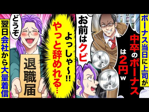 X Facebook はてブ Pocket LINE Pinterest ボーナス当日に上司が「中卒のボーナスは2円wお前はクビ」→大 タグ:スカッと 噂のスカッと チャンネル名:噂のスカッと 投稿時間:2024-08-09 02:00:08